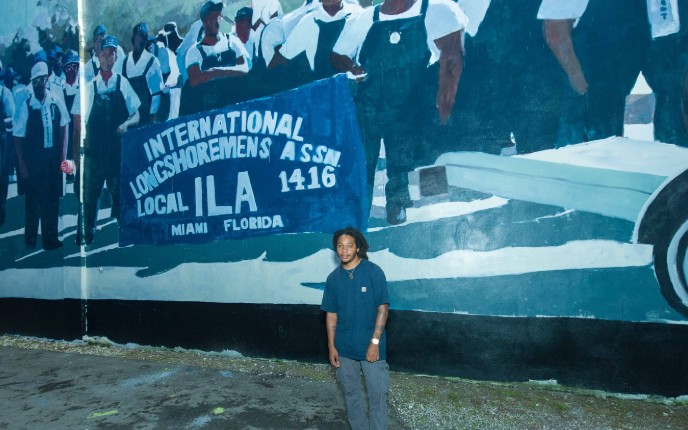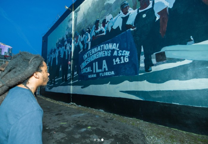 1) Reginald O’Neal is a well-known name in the Miami art scene, and deservedly so. Born in Miami, FL, and raised in the historically Black neighborhood of Overtown, he paints narratives drawn from his upbringing and the essence of what surrounds him. His sensibility is evident whether he’s creating a handheld-sized piece or a large mural, many of which exist both locally and abroad. One of my personal favorites is his mural honoring the International Longshoremen’s Association (ILA) Local 1416 in Overtown, completed in late 2022. I recommend visiting not only the mural but also the neighborhood, which, sadly, grows a little less like the Overtown O’Neal grew up in with each passing year. When you visit, you’re not only encountering the work but also the foundational physical context which shapes his very practice. Up close, you’ll find QR codes embedded in the mural that link to oral history videos documenting the contributions of Black longshoremen in Miami.