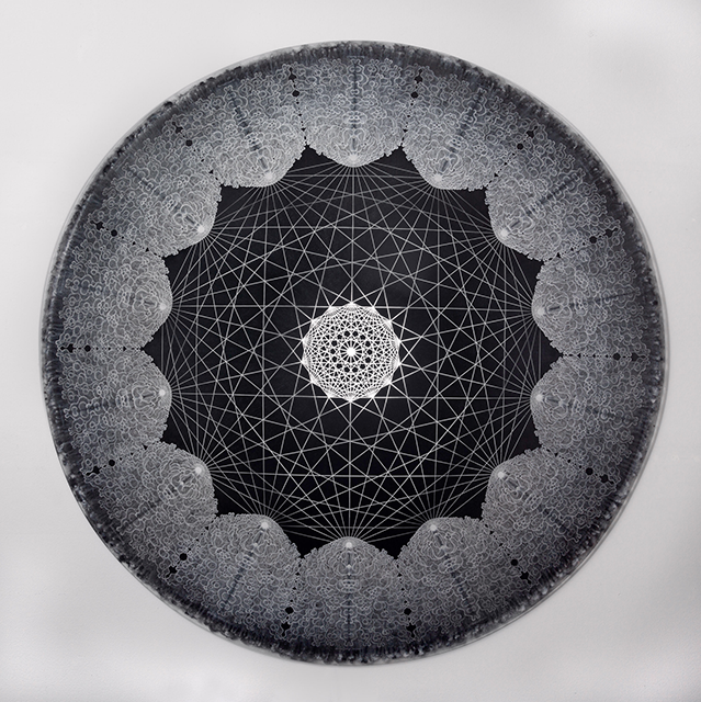 For her, silverpoint is more than a tool; it is an intimate channel of communication, offering respite from the dizzying speed of our techno-centric world. The same is true for her viewers, who are drawn into its quiet beauty. Her luminous works cast star-like patterns across gallery walls, their shimmering globes revealing intricate, abstract geometries beneath the surface. These celestial forms emerge from a painstaking process: Prusa first sandblasts her panels, then applies gesso, silverpoint, and titanium-white pigment, creating the impression of a heavenly constellation suspended in space.
