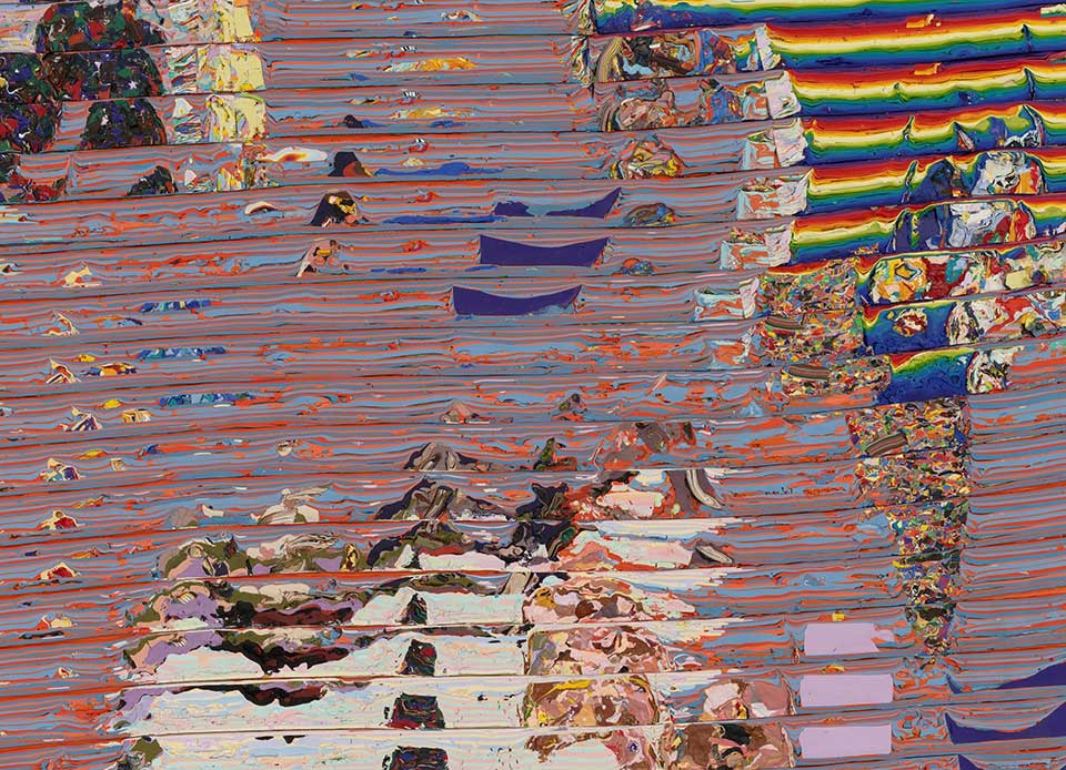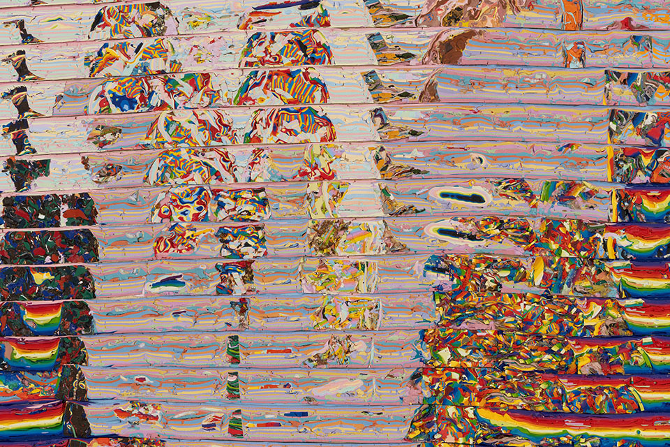 Over extended periods, he pours layers of latex pigment into molds, allowing each to cure before adding the next. Once solidified, these blocks are sliced, rotated, and reassembled into corrugated planes. The resulting surfaces resemble cross-sections of their own formation; seams, ridges, and tonal shifts register both the rhythm of work and the passage of time.